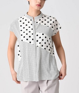 大小ドット生地のランダムな組み合わせとバンドカラーのスッキリネックデザインが印象的なブラウス♬